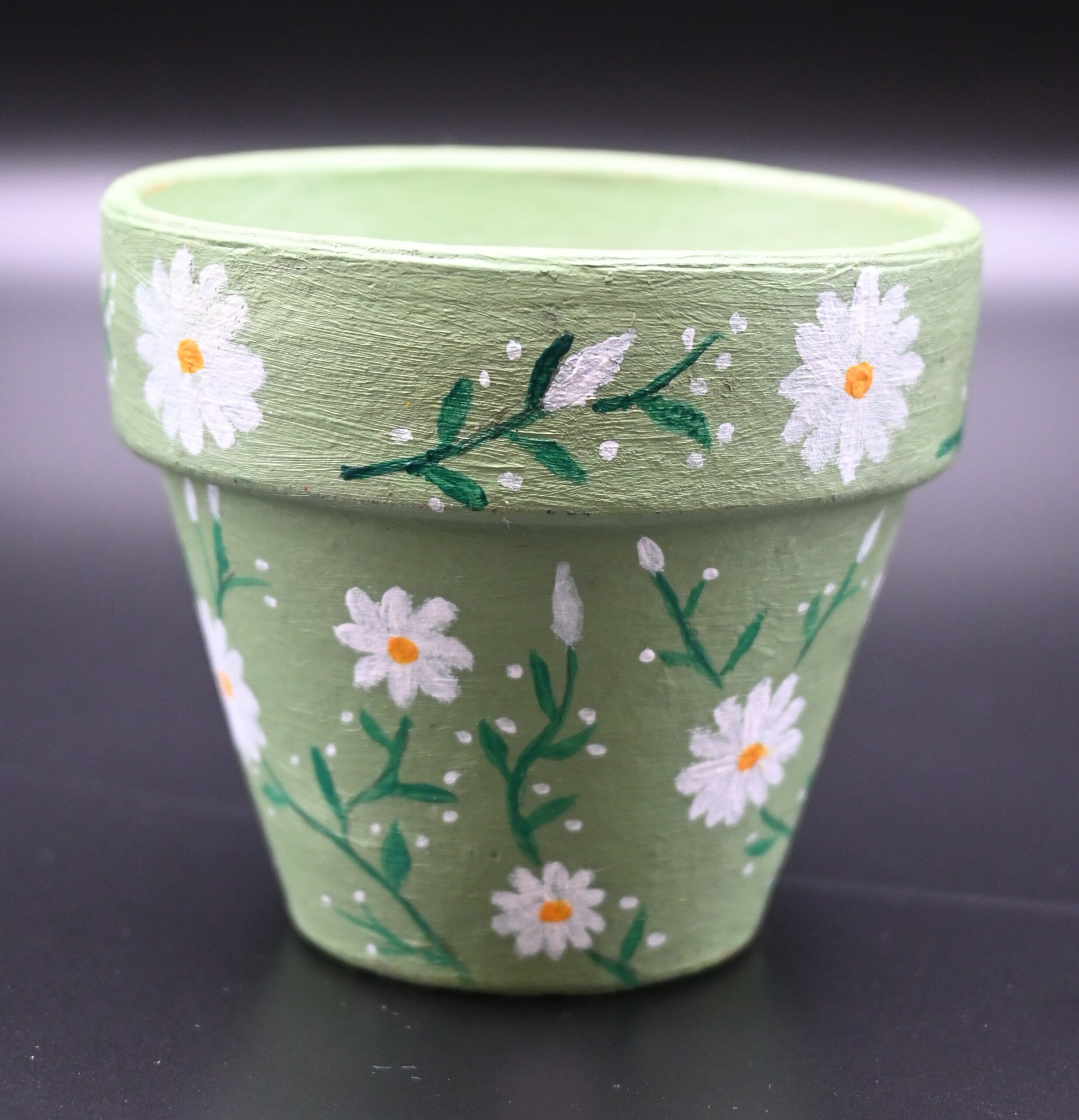 Pot de fleur en terre cuite – Vert clair avec motifs floraux blancs